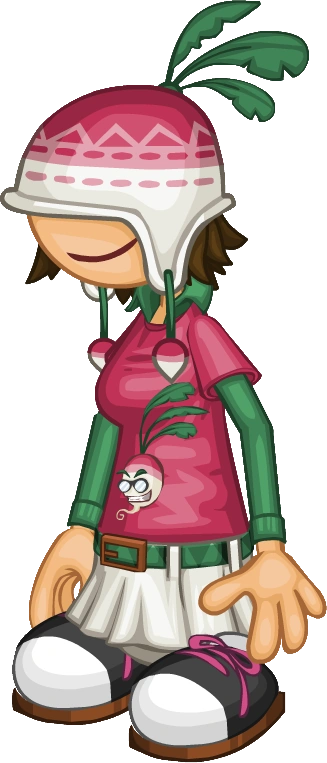 Radlynn is a rambunctious teen who grew up in Oniontown. Her strange affinity for radishes can be traced back to when she was approached by a mysterious man in a wide brim hat. He asked Radlynn to watch a crate of hamburger buns for a few hours. In return she was given a shoebox containing 5 "radish" coins, 3 paper clips, 2 mismatched buttons, some sawdust, and a gently used knitted hat.