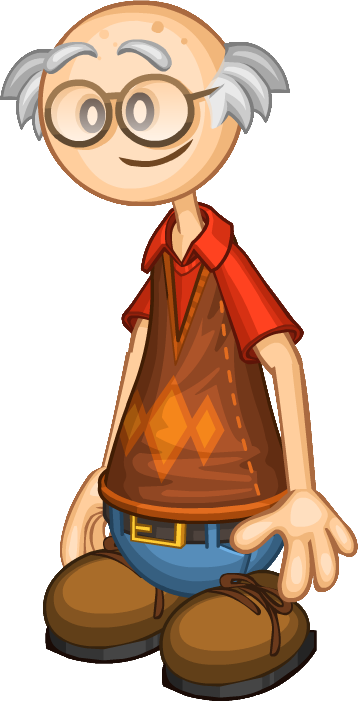 Wally is an old man with light skin, light gray hair in each side, wears a pair of brown eyeglasses, a red shirt with a brown vest with light-colored triangles, blue pants, and brown shoes with brown laces and soles.